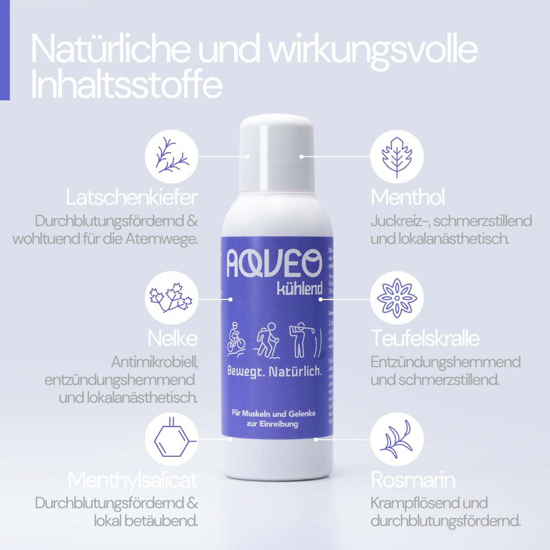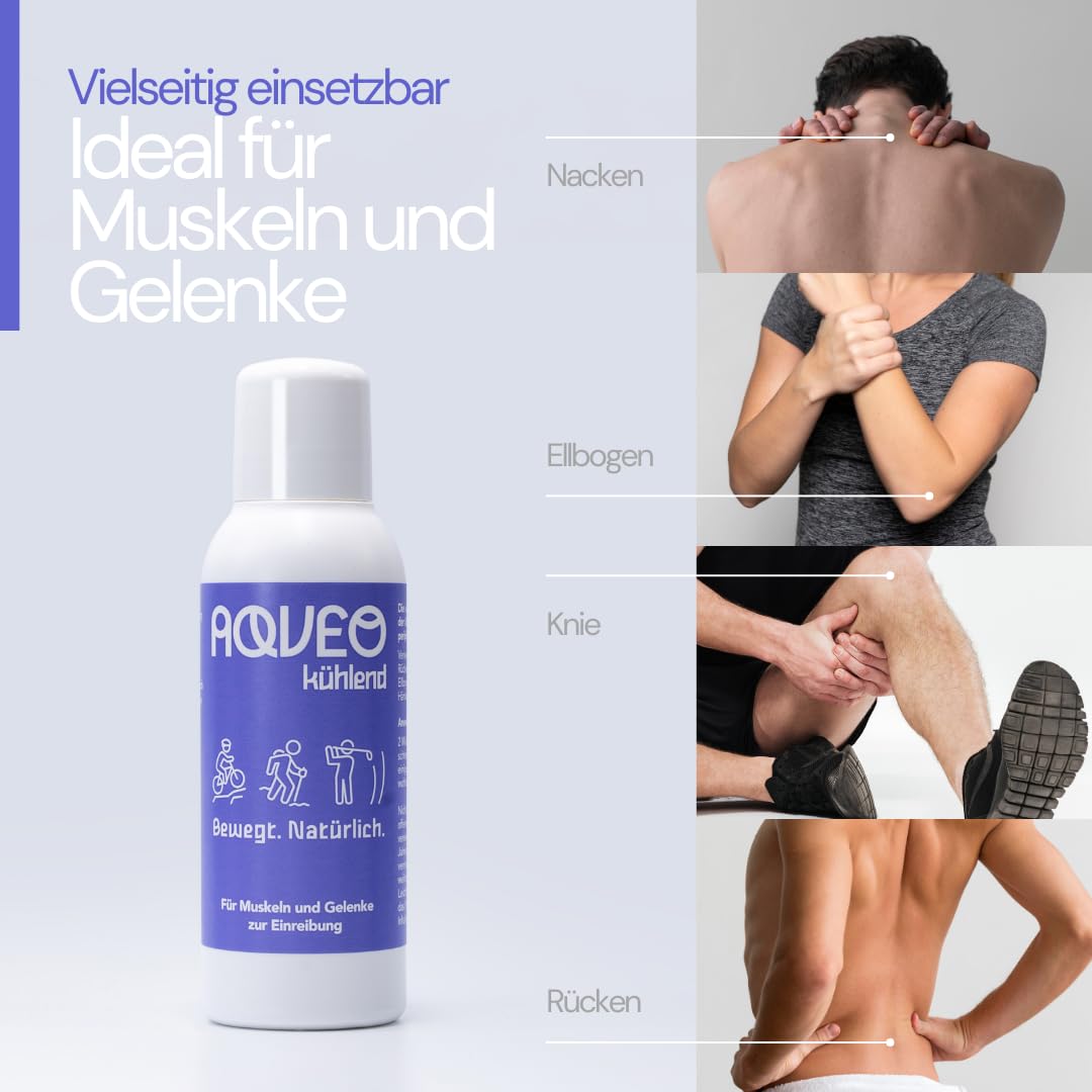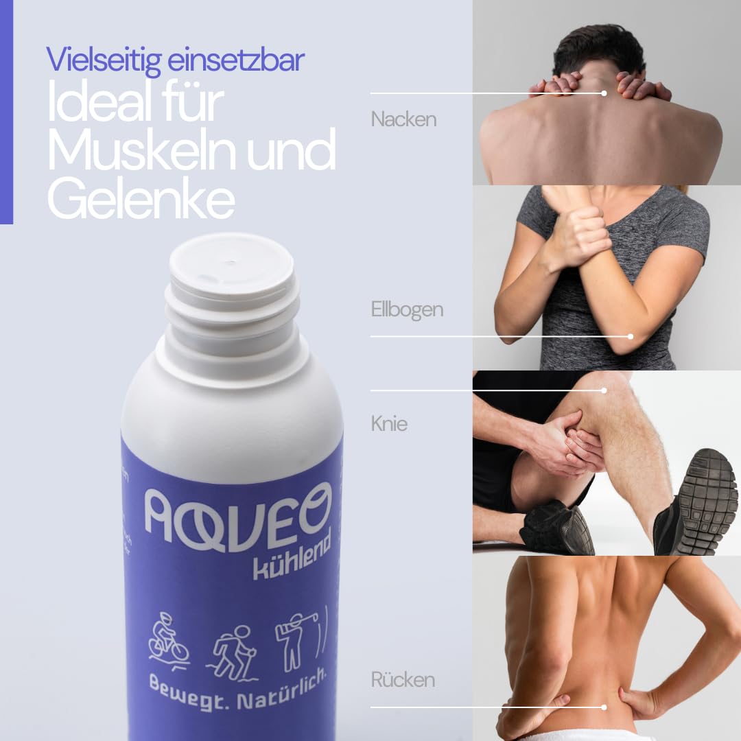 Aqveo kühlend verwendet man um Muskeln und Gelenke gut zu durchbluten. Reiben Sie die entsprechenden Areale mit dem Öl ein. Nach einigen Minuten stellt sich eine wohltuende Kühlung ein und Ihre Haut wird rosig.