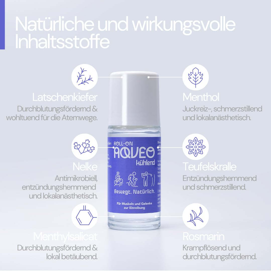 Aqveo kühlend verwendet man um Muskeln und Gelenke gut zu durchbluten. Reiben Sie die entsprechenden Areale mit dem Öl ein. Nach einigen Minuten stellt sich eine wohltuende Kühlung ein und Ihre Haut wird rosig.